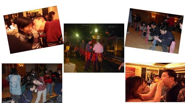 纸杯传水:7人一组,同时进行比赛。另有二名人员辅助每组第一名人员倒水至衔着的纸杯内,再一个个传递至下一个人的纸杯内,最后一人的纸杯内的水倒入一个小缸内,最后在限定的五分钟内,看哪个组的缸内的水最多,哪个组就获胜。