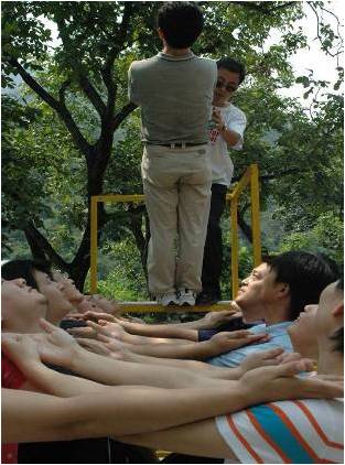 团队全部成员在规定的时间内共同翻越一面高4米的光滑墙面,在此过程中,大家不能借助任何外界的工具,包括:衣服、皮带、绳子等。所能用的资源只有每个人的身体。