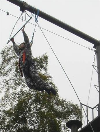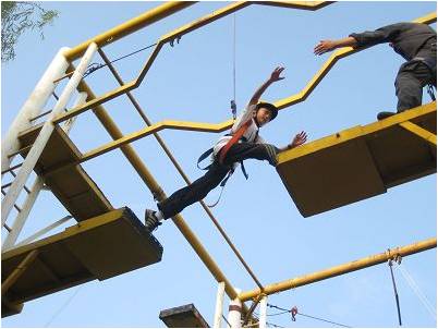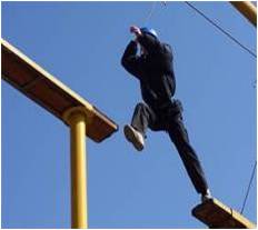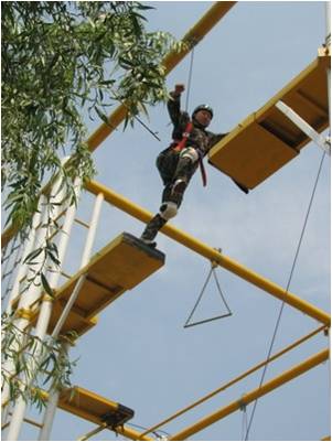 学员在8米的高空,在宽30厘米的断桥上,从桥的一端跳向另一端,然后再跳回到出发点。
