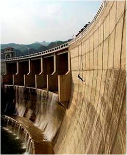 坝降是一个勇敢者的游戏,要求每个小组的部分队员在教练的指导与保护下,利用国际专业攀登器材,从岩壁顶端下降,队员自己掌握下降的速度、落点,以到达地面。