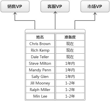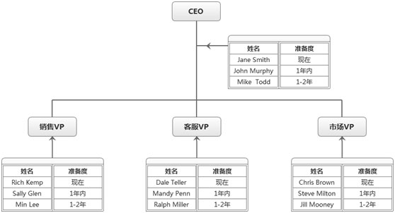 替代计划(Replacement Planning)假设组织框架将保持不变。它通常只是在组织框架图上为高层级的岗位储备替补。典型的替代计划会为每个高层级的岗位列出3个后备人员以及各自的准备度(参见图1)。