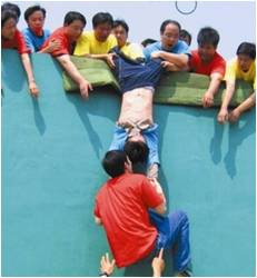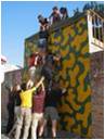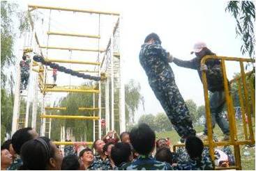 团队全部成员在规定的时间内共同翻越一面高4米的光滑墙面,在此过程中,大家不能借助任何外界的工具,包括:衣服、皮带、绳子等。所能用的资源只有每个人的身体。