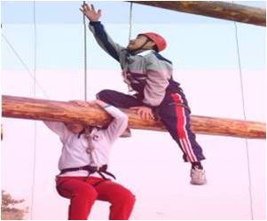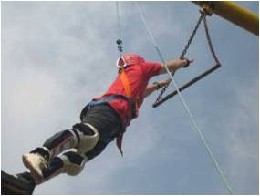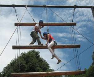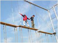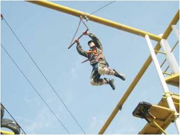学员在8米的高空,在宽30厘米的断桥上,从桥的一端跳向另一端,然后再跳回到出发点。