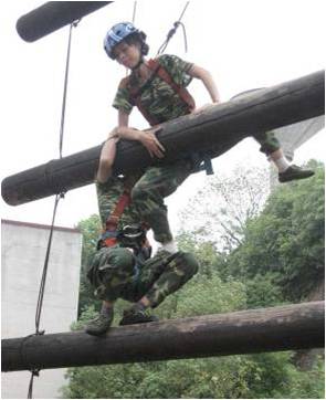直径大于20公分的六根木桩成梯状悬于12米高空,最低一根距地约1.2米,且间距自下而上逐渐增大,小组成员被随机分为2人一组,相互配合,共同登顶
