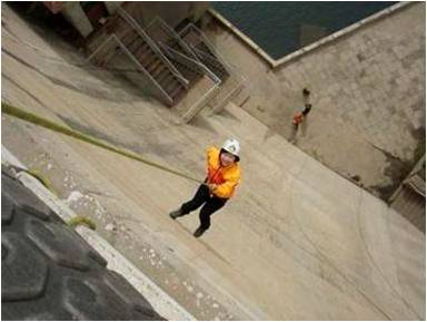 坝降是一个勇敢者的游戏,要求每个小组的部分队员在教练的指导与保护下,利用国际专业攀登器材,从岩壁顶端下降,队员自己掌握下降的速度、落点,以到达地面。