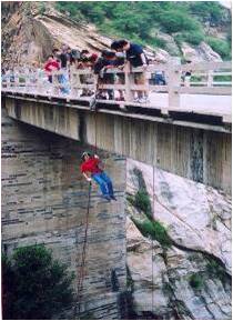 大桥速降降是一个勇敢者的游戏,要求每个小组的部分队员在教练的指导与保护下,利用国际专业攀登器材,从大桥顶端下降,队员自己掌握下降的速度、落点,以到达地面。